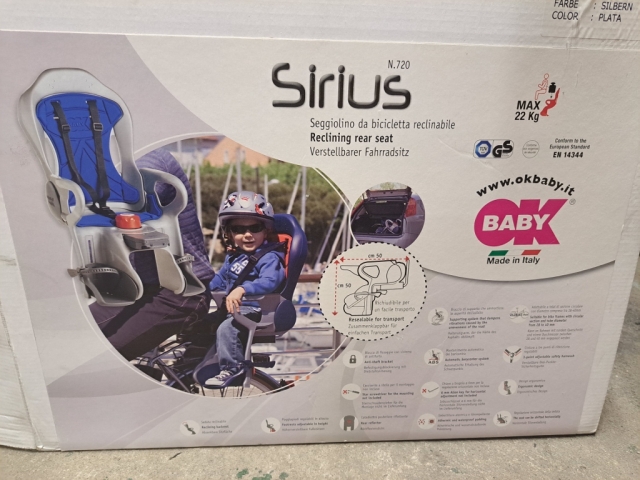 A Sirius exkluzív rendszerének segítségével a háttámlát könnyedén állíthatjuk akkor is, amikor a gyermek az ülésben van: csak fordítsuk el a gombot, és a háttámla előre vagy hátra dől. A gyermekülés 30°-ban dönthető az egyensúly veszélyeztetése nélkül: a kerékpár minden helyzetben stabil marad a szabadalmaztatott ABS (Automatic Baby Center System) rendszernek köszönhetően, mert a gyermekülés minden pozícióban megtartja a súlypontját, így manőverezés közben is biztonságosan kerékpározhatunk. A gyerekülés össze is csukható, így könnyen szállítható. A rögzítő rendszer elnyeli az út egyenetlenségeiből fakadó rezgéseket, így kényelmes utazást biztosít a gyermek számára. Különleges, atermikus párnázat zárt cellás poliuretán habból (zárt cellás szivacsból), amely nemcsak vízhatlan, de a napon is kint felejtheted, nem fog felmelegedni sőt, télen is meleg érzetet biztosít a csemetéknek! Állítható lábtartók, hárompontos, magasságában és hosszúságában állítható biztonsági öv biztonsági öv, dönthető és lehajtható háttámla, fényvisszaverő prizma, zárható adapter.